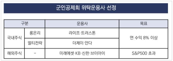 군인공제회는 각사에 100억원씩 출자한 뒤 운용 성과에 따라 추가 자금 납입 여부를 결정할 것으로 관측된다. 국내주식은 연간 8% 이상을, 해외주식은 S&P500 대비 초과 성과를 목표로 한다.